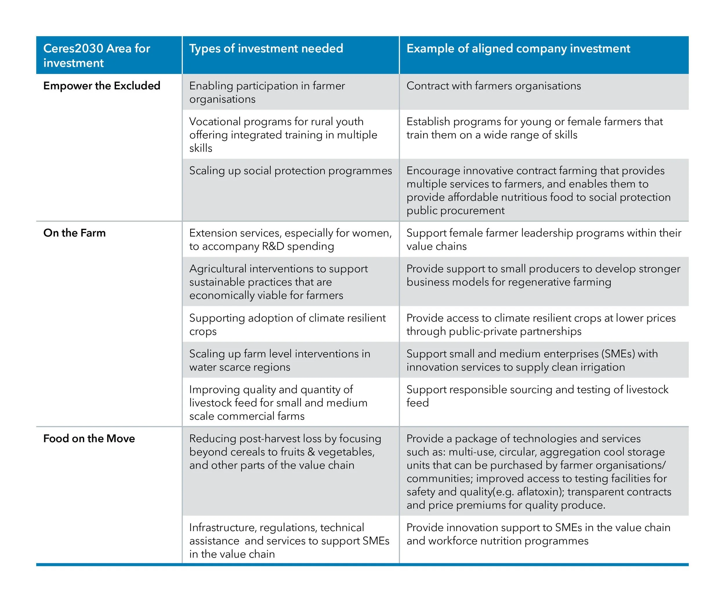 The action outlined by Ceres2030 takes place across three broad areas: Investments to empower the excluded (for example: strengthen farmer organizations, education for rural youth, social protection); investments on the farm (for example, farm extension, irrigation, finance, infrastructure, R&D, production subsidies); and investments for food on the move (for example, infrastructure and technical assistance to help small and medium enterprises, investment in storage and sustainable energy and cold chains).