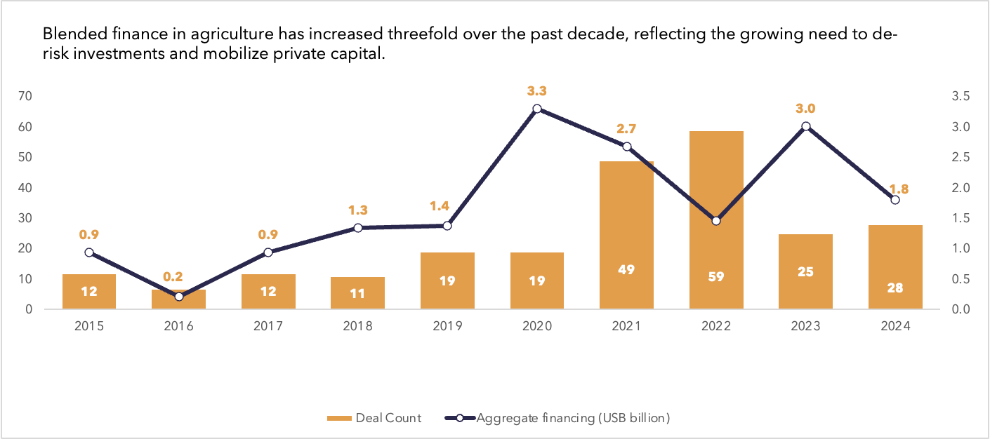 Blended finance is growing in importance. In agriculture, the number and volume of blended finance deals have expanded significantly over the past decade, with estimates suggesting a doubling of activity between 2015 and 2024 (see Figure 1). This growth points to a rising reliance on blended structures as a tool for de-risking investments, mobilising private capital, and scaling sustainable solutions.